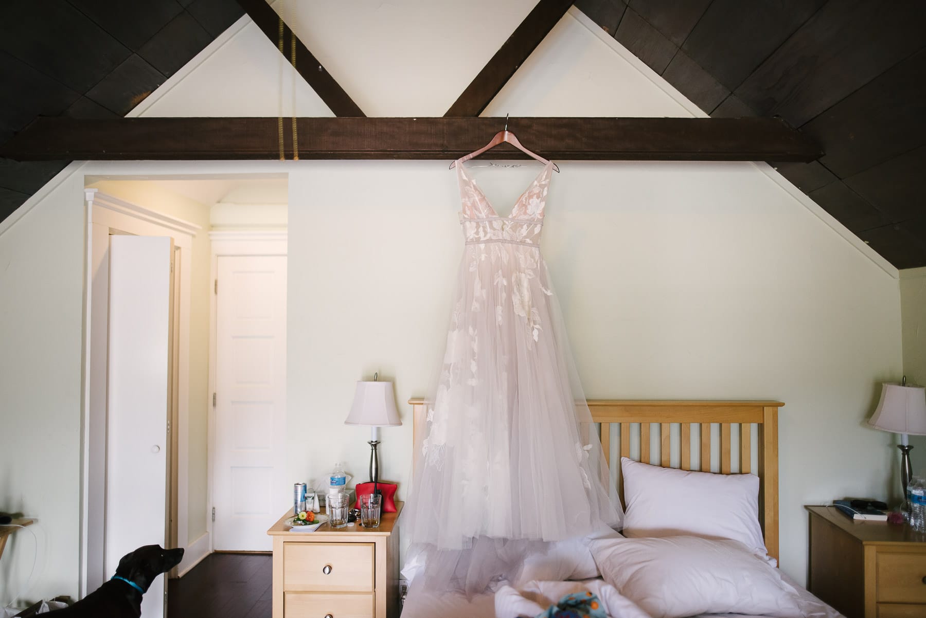 Lunarosa and Leo’s room at the Highland Dell Lodge looked out over the Russian River. From their small balcony, you could see swimmers and sun lovers hanging out on the beach across the river. Leo and his groomsmen got ready in the room overlooking the river while Lunarosa and her bridesmaids got ready in the room across the hallway. We did a little room switching when Lunarosa put on her wedding dress.