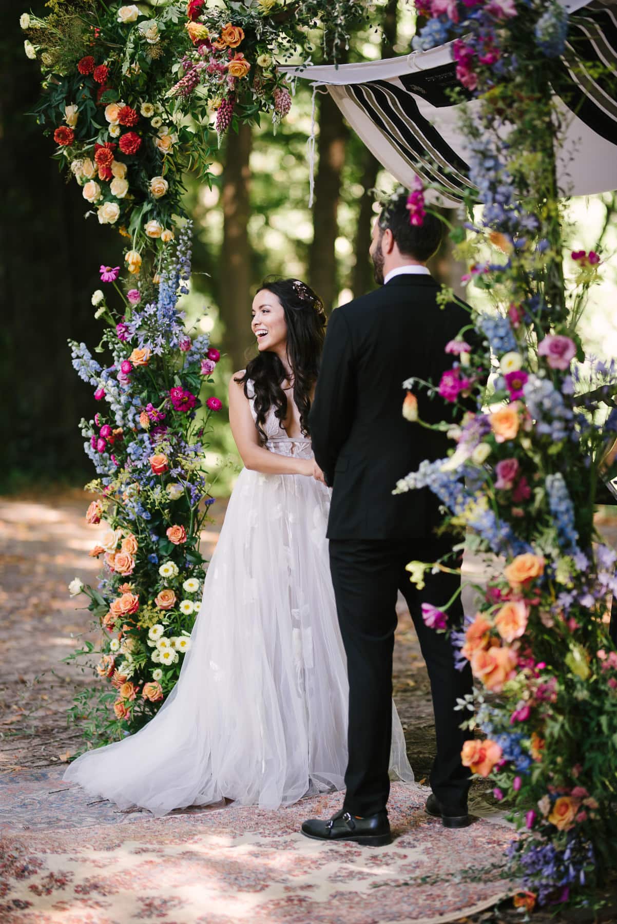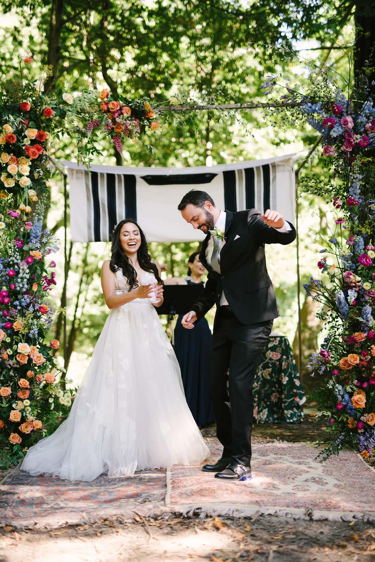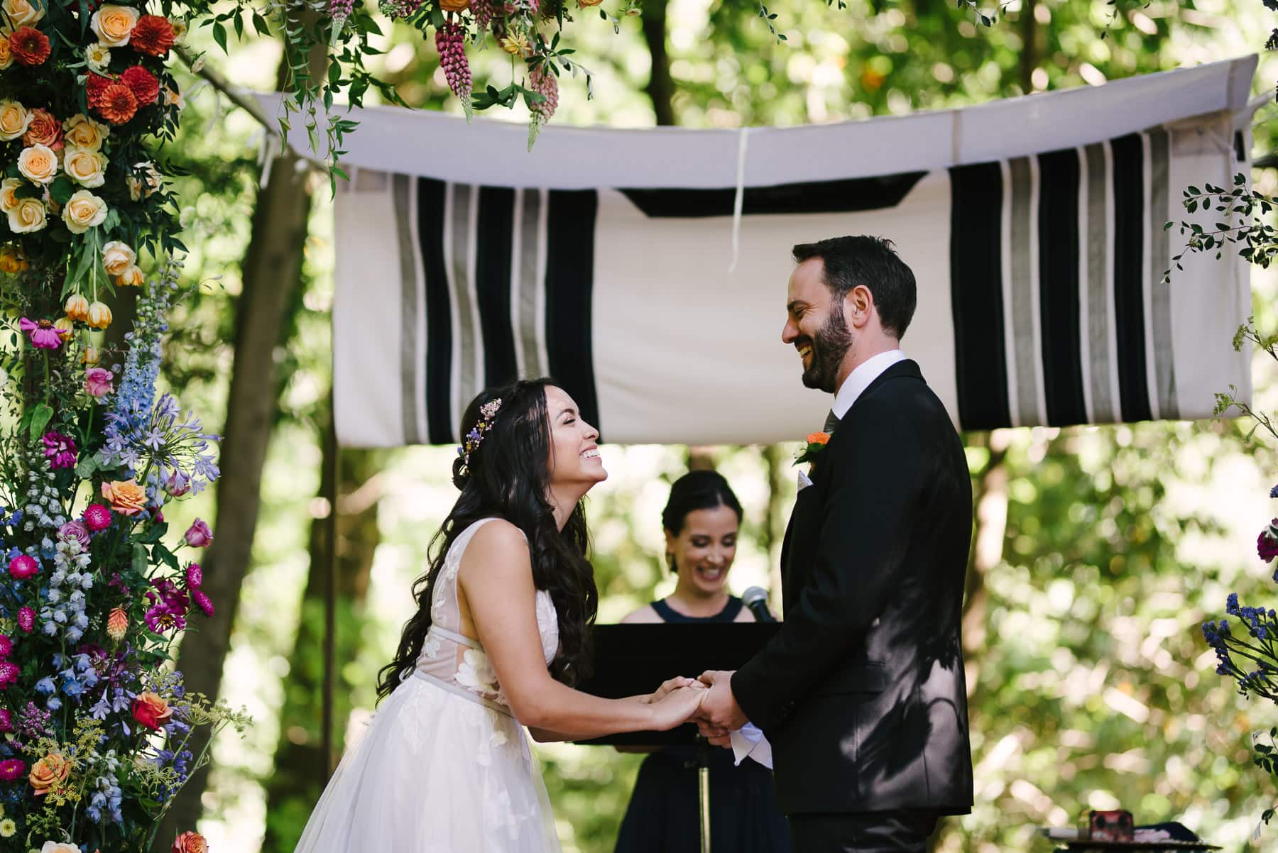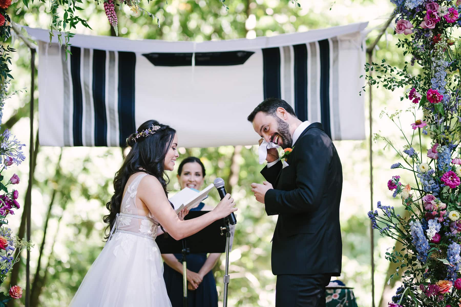 Once we were done with immediate family and wedding party pictures, we headed to the Monte Rio Amphitheater. Most people walked over. The ceremony area was set up under Bay Laurel and Oak trees. A huppa, a gorgeous flower arch, and carpets adorned the space where Lunarosa and Leo got married. They combined their Jewish and Mexican traditions in a sweet and personal ceremony.